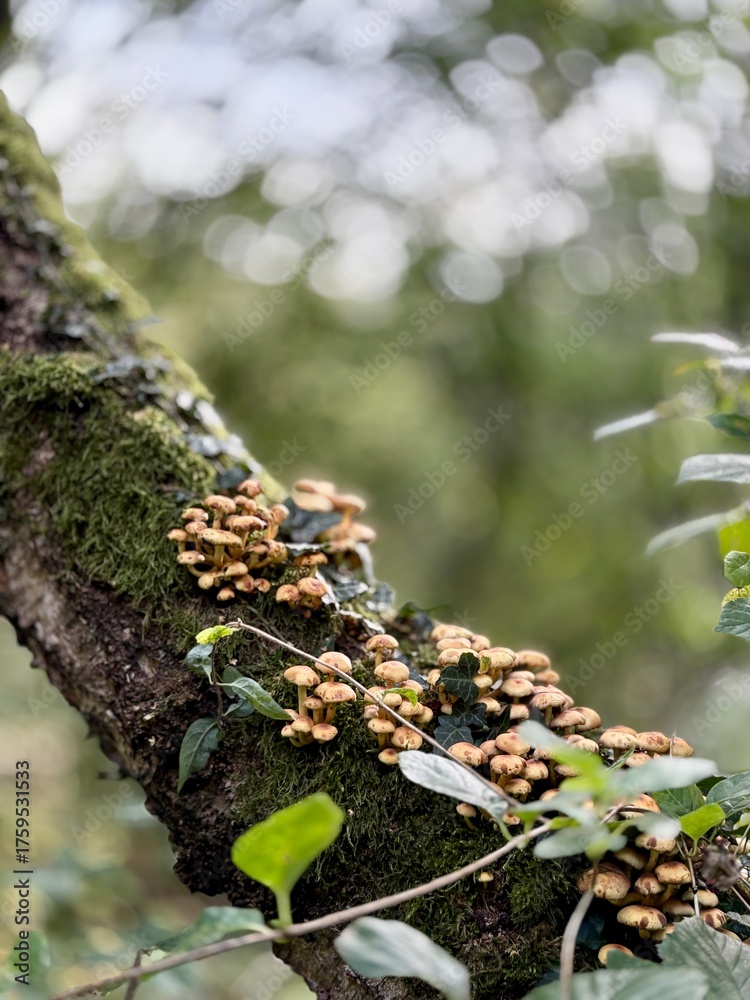 Clusters of tan mushrooms grow densely on a mossy, fallen tree trunk in a lush forest. Surrounded by green foliage, the fungi thrive in the damp, shaded environment, creating a rich, natural woodland