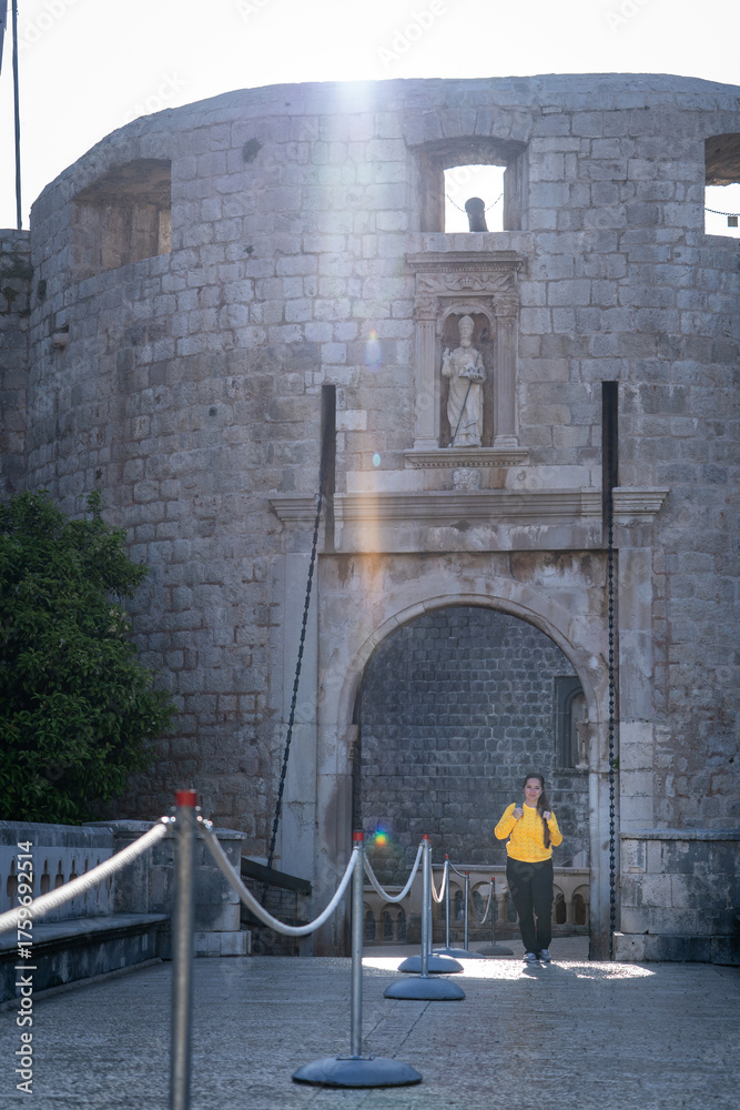 Mujer turista atravesando la Puerta de Pile. Ingreso a la ciudad amurallada de Dubrovnik. Fotografía vertical