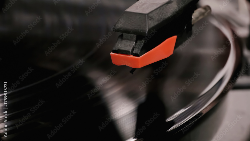 Suspended vinyl record stylus captured in dramatic macro detail against dark background. Close-up highlights precision audio equipment and nostalgic analog music technology with cinematic aesthetic.
