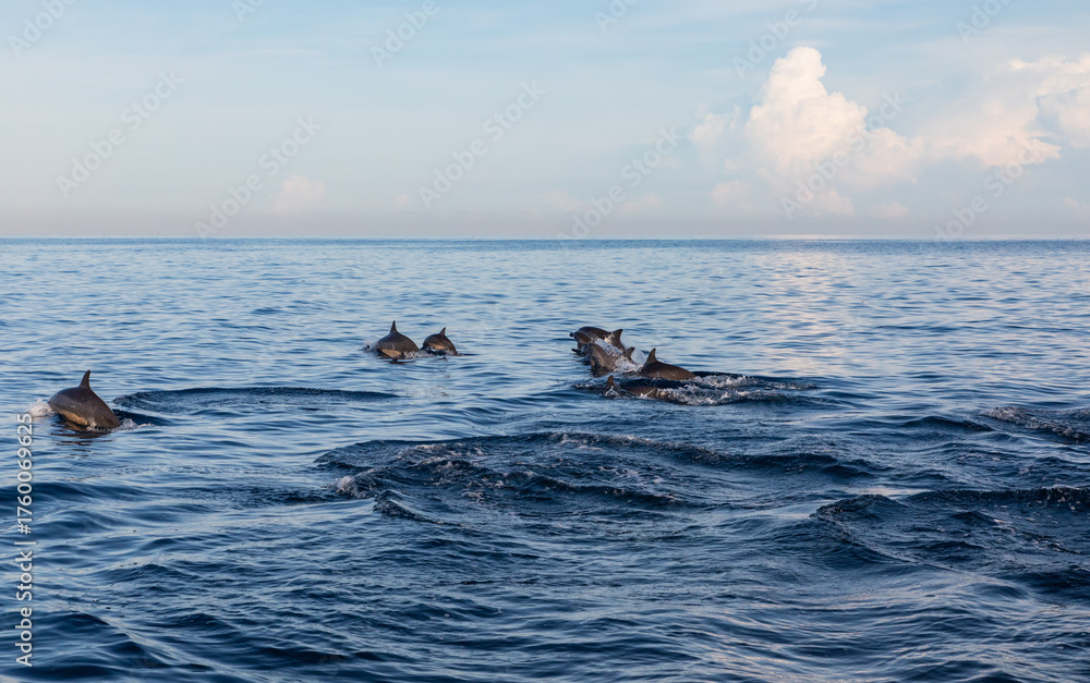 Watch playful dolphins swim and leap in the open ocean under a clear sky, perfect for travel adventure campaigns and marine wildlife conservation efforts