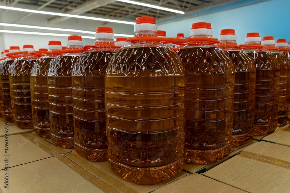 Large plastic bottles filled with cooking oil arranged in rows on cardboard boxes. Food supply, retail, and bulk packaging concept.