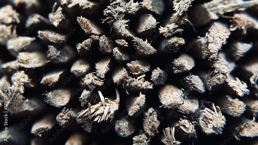 Macro photo of compressed dried coconut leaf midribs showing the rough, fibrous texture of natural broom material. The image highlights the dense arrangement and organic surface details.