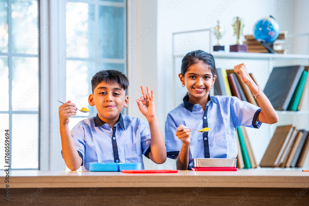 Indian students enjoy lunch break, sharing tiffin laughter in classroom wearing school uniforms