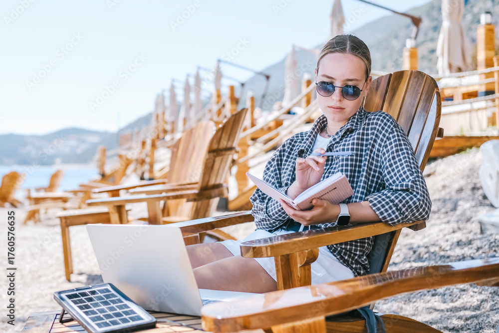 Beach workation digital nomad plans tasks with laptop and notebook on lounge chairs, powered by a portable solar charger. Eco-friendly, productive, flexible lifestyle by the sea. now