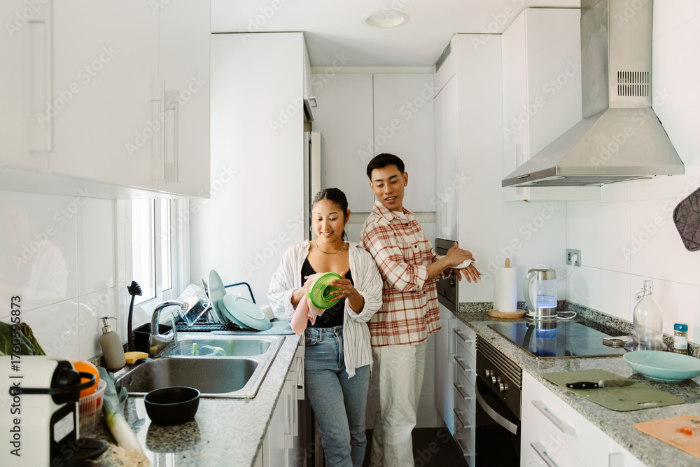 A man wipes his hands with a napkin while talking to a woman standing next to him and wiping the juicer attachment with a towel