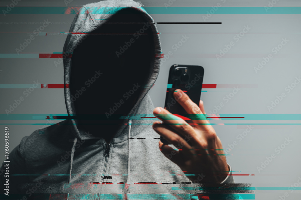 Hooded man with obscured face using smartphone, symbolizing hacker activity, data theft, and cyber security threat.