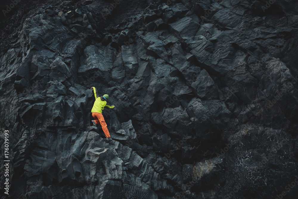 male rock climber. rock climber climbs on a black rocky wall on the ocean bank in Iceland, Kirkjufjara beach. man makes hard move without rope.