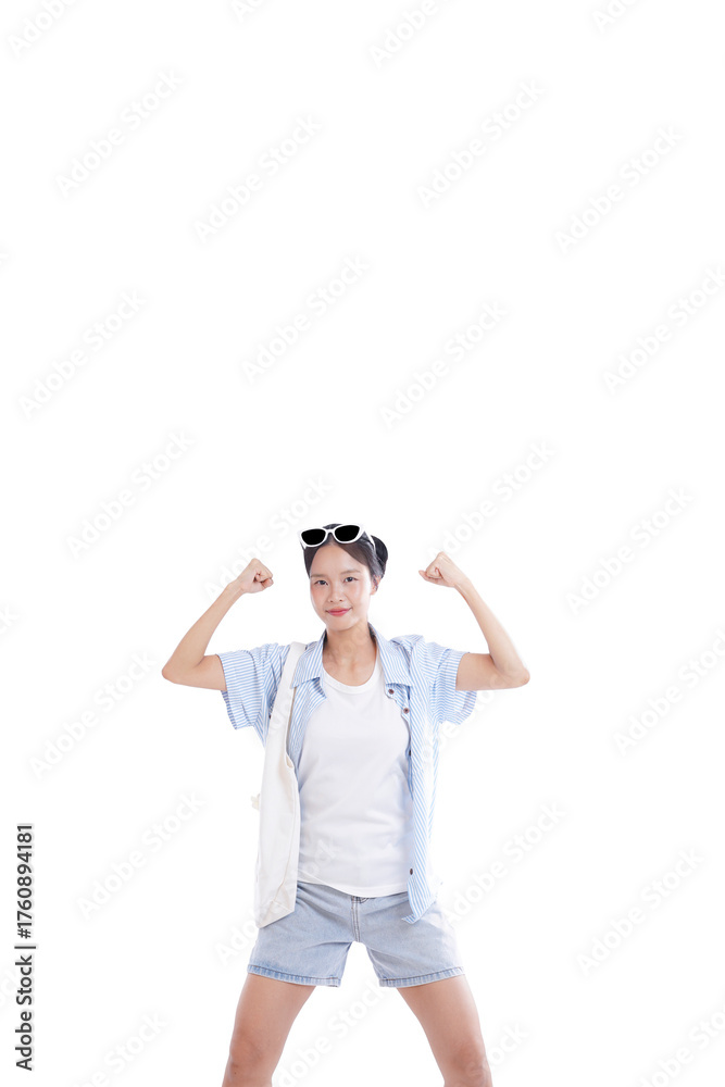 Strength and Confidence: A vibrant woman confidently flexes her muscles, embodying strength and self-assurance against a clean background, ready for adventure.