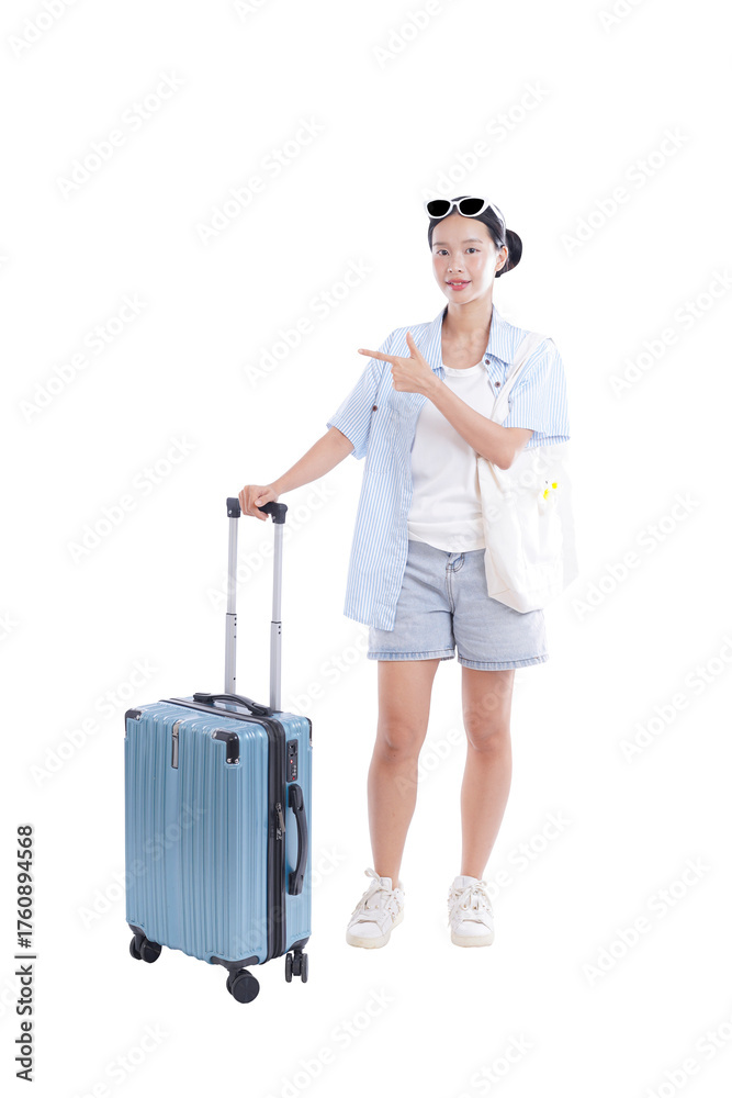 Ready for Adventure: A cheerful traveler, radiating enthusiasm and anticipation, stands poised with her luggage, ready to embark on a journey filled with new experiences and explorations.