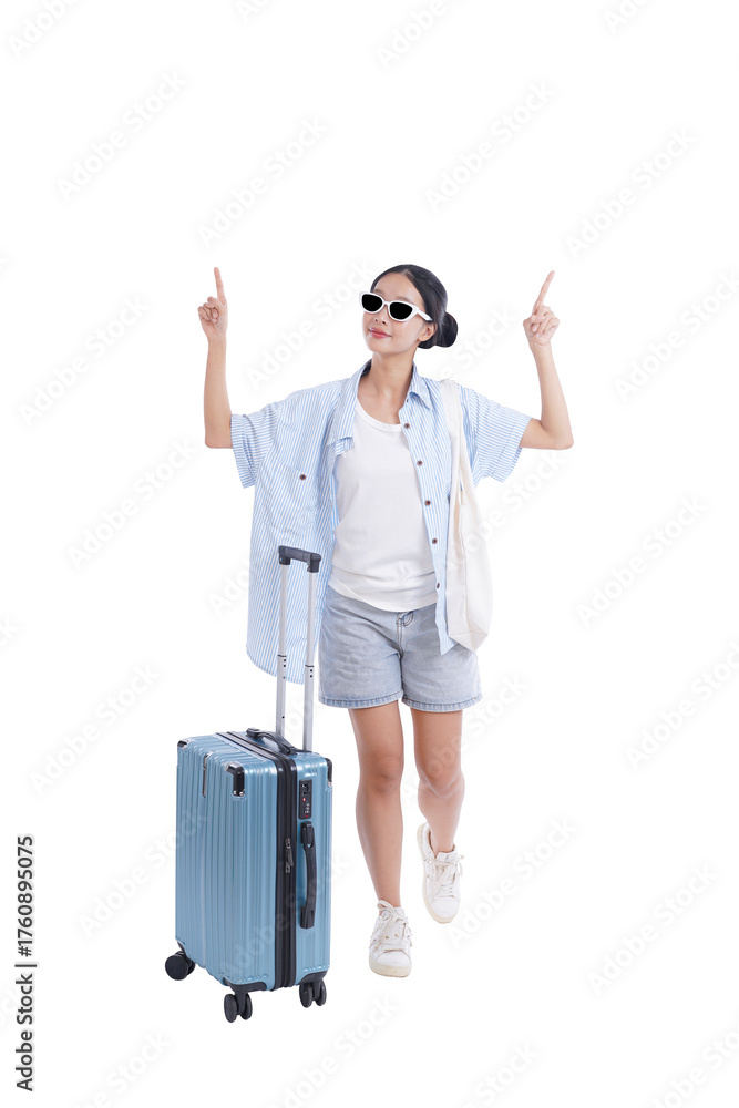 Travel Ready: A young woman, filled with excitement, embarks on her travel journey with a suitcase. She is dressed in casual attire, pointing upwards.