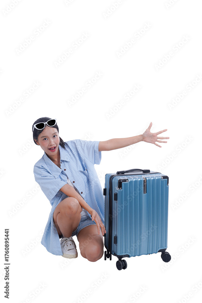Ready for Travel: A young traveler eagerly poses with her suitcase, exuding excitement and the promise of adventure.
