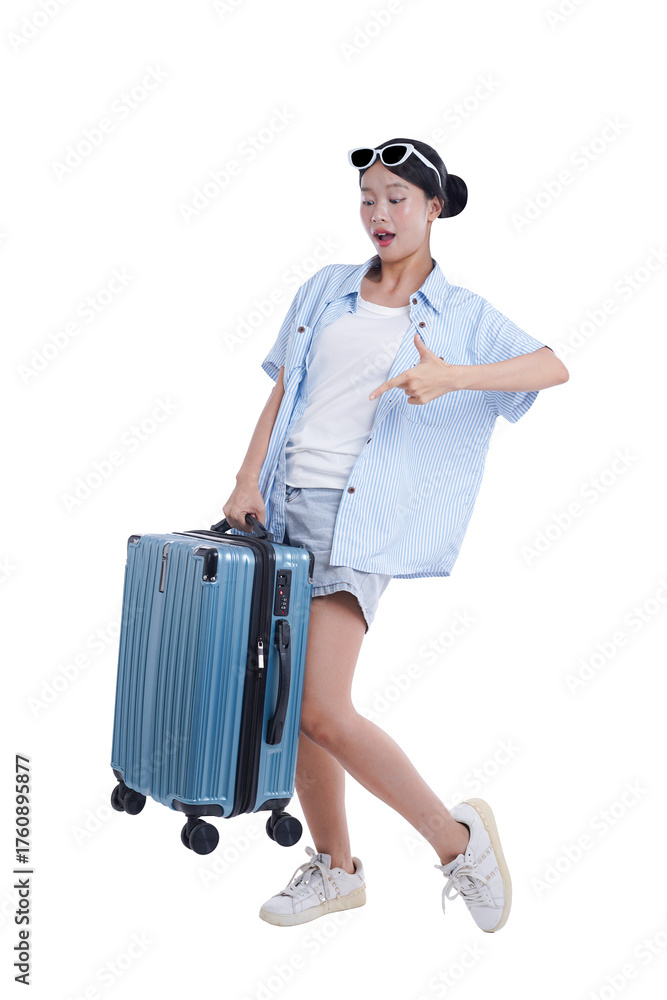 Ready for Adventure: A woman, radiating excitement and wanderlust, stands beside her travel suitcase, ready to embark on a journey filled with new experiences and unforgettable moments.
