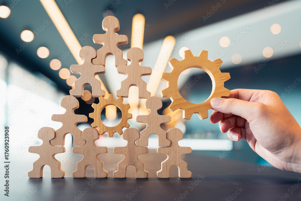 Wooden human figures stacked in pyramid with gear symbol held by hand. Concept for teamwork, business collaboration, organization structure, leadership, HR strategy, and system integration.