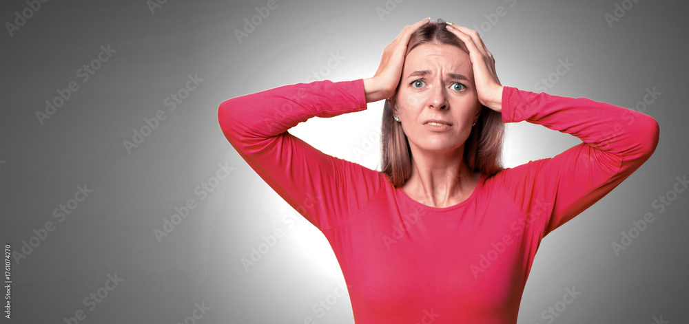 A woman in a red long-sleeve shirt looks distressed, pressing her hands to her head. She shows signs of anxiety and stress in a dramatic moment of emotional struggle