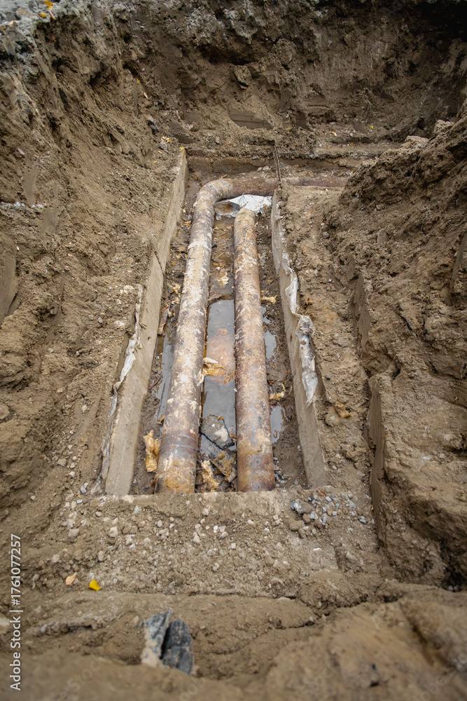 Construction site shows exposed old pipelines in trench during urban infrastructure project in late afternoon light