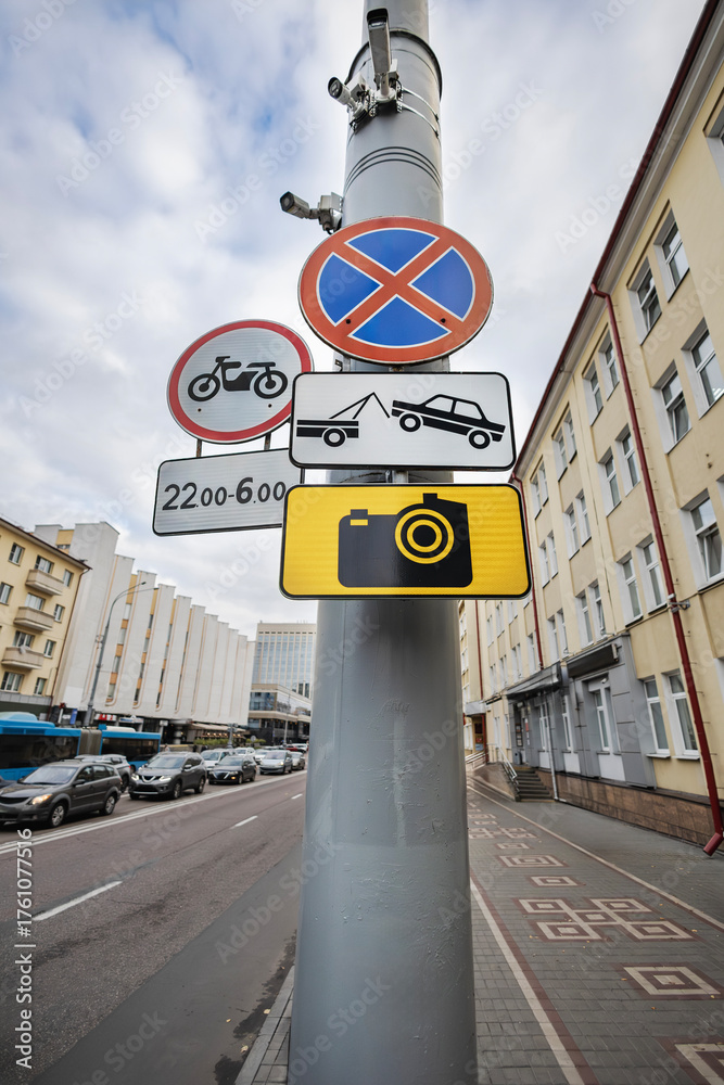 Traffic signs indicating restrictions and parking rules on a city street with cloudy sky and buildings