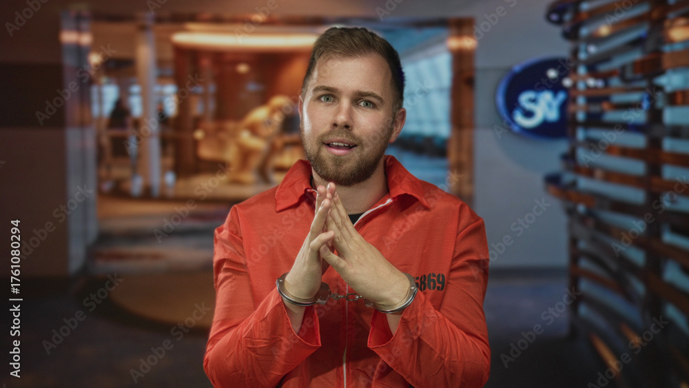 Young prisoner man with handcuffs and palms up in orange jumpsuit inside hotel building; regret plea.