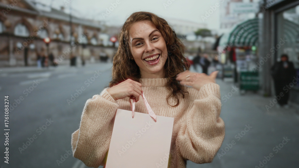 Woman smiling on city street wearing cozy sweater while holding a shopping bag outdoors, urban lifestyle portrayed in vibrant daylight setting with blurred pedestrians.