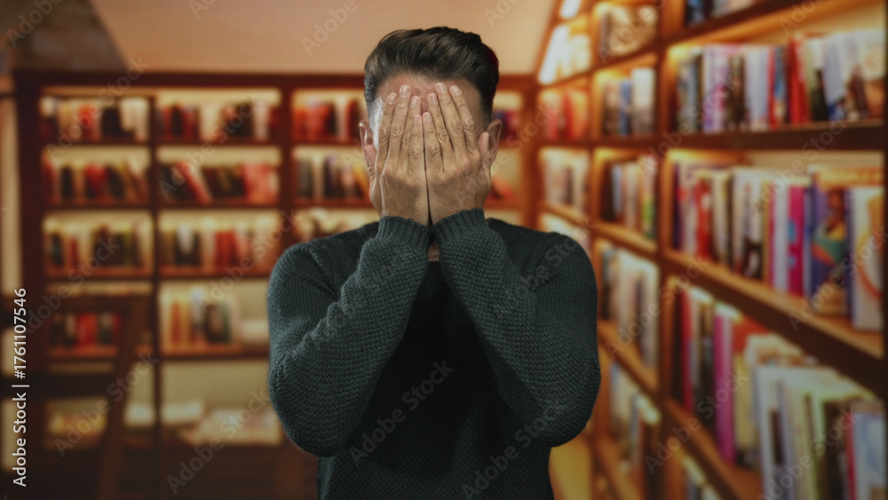 Young hispanic man covers face with both hands amid bookshelf in building; anxiety vulnerability privacy.
