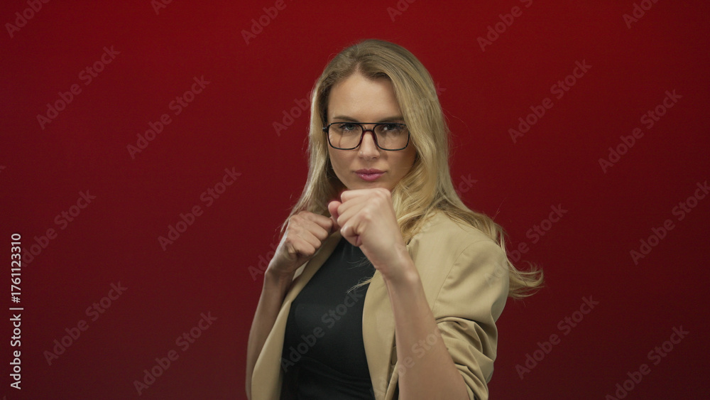 Young blonde woman in glasses stands confidently against red background with fists up, conveying strength and determination, wearing beige blazer and black top, isolated setting.