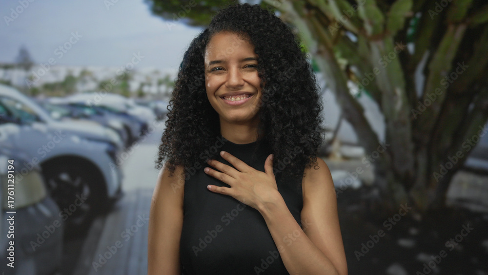 Young hispanic latina woman points index finger while pressing hand on chest in urban parking lot; refusal sincerity.