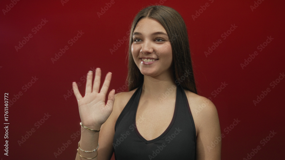 Teenager girl wearing black tank top waving right hand in red studio with subtle bracelets on wrist; friendly greeting.