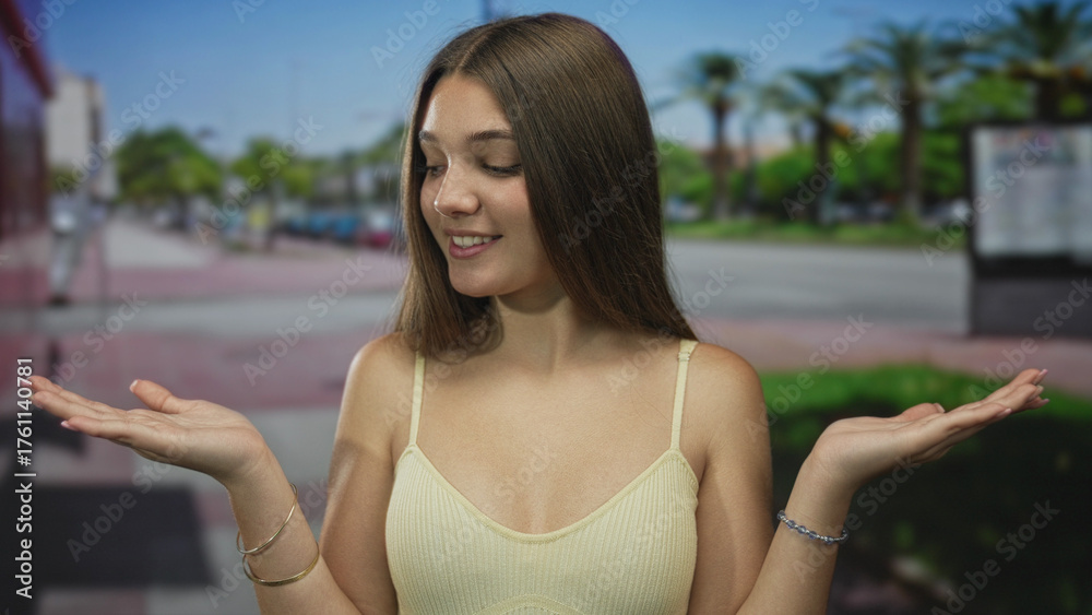 Teenager girl with bare shoulders and a slight smile spreads open palms on a city street; uncertainty.
