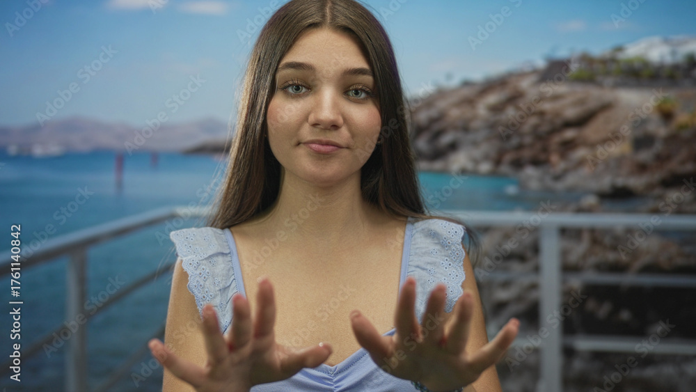 Girl holds her hands forward in a stop gesture at a rocky seaside railing under bright sunlight; serenity.