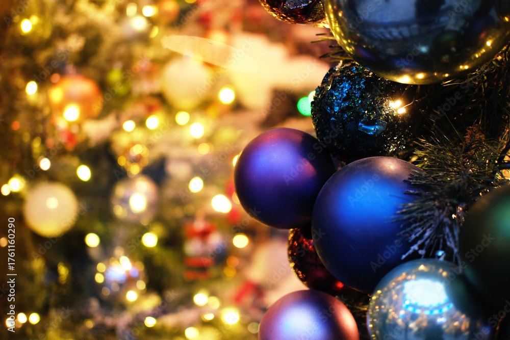 Colorful Christmas ornaments in various shades hang on a beautifully decorated tree, surrounded by twinkling lights and festive decorations, creating a joyful holiday atmosphere