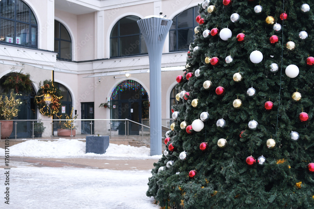 Christmas tree adorned with colorful ornaments stands prominently in a winter setting, surrounded by a residential complex, creating a festive holiday atmosphere with seasonal charm