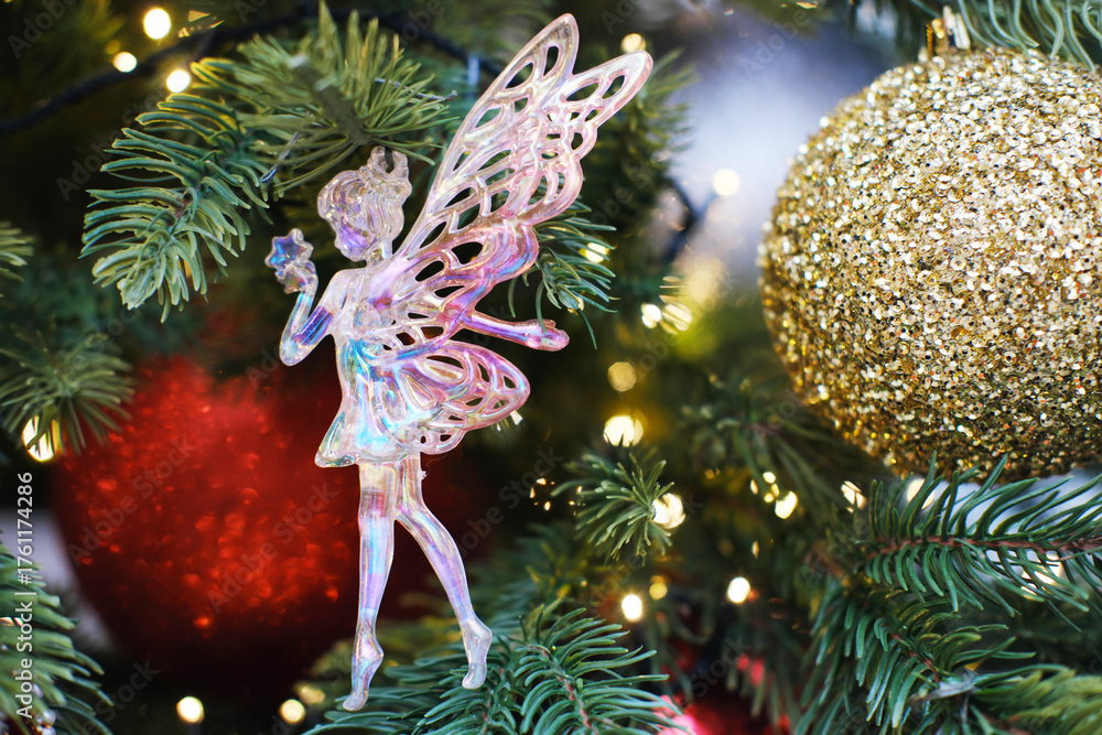 Christmas tree decoration featuring a whimsical fairy ornament with vibrant colors, surrounded by shimmering baubles and twinkling lights, ideal for festive card mockup with copy space