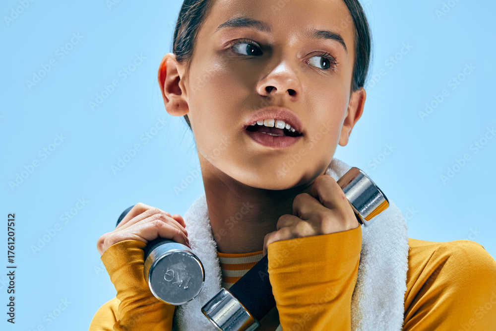 Female fitness portrait of a woman holding small dumbbells and a towel, sweat on skin, yellow long sleeve top, hair pulled back, determined expression, studio blue background