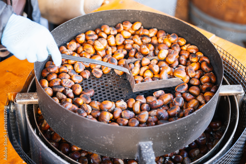 Vendor roasts chestnuts in a large machine, scooping them for customers