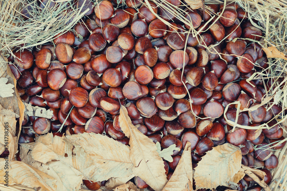 Freshly harvested chestnuts nestled with autumn leaves and straw, ready for roasting