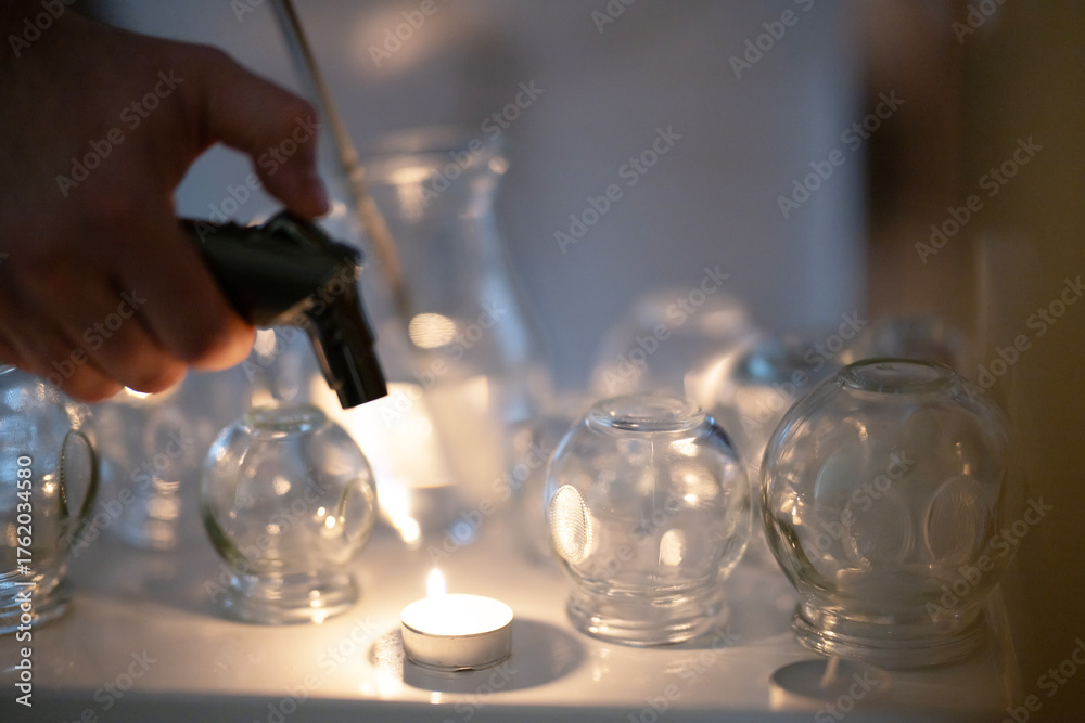 Close up view of a therapists hands preparing glass cups and lighting candles for traditional fire cupping therapy. Concept of alternative medicine, relaxation, and natural healing treatments.