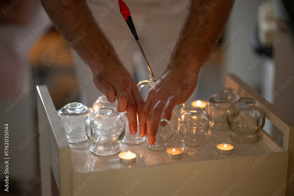 Close up view of a therapists hands preparing glass cups and lighting candles for traditional fire cupping therapy. Concept of alternative medicine, relaxation, and natural healing treatments.