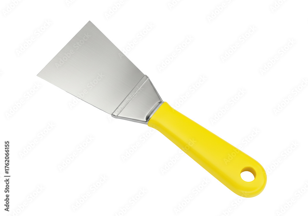 Metal spatula with yellow handle isolated on transparent background, kitchen utensil for cooking and baking food preparation