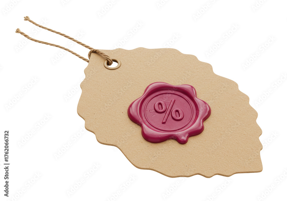 Leaf-shaped brown paper tag with red percentage wax seal isolated, vintage style price tag for retail and discount promotions