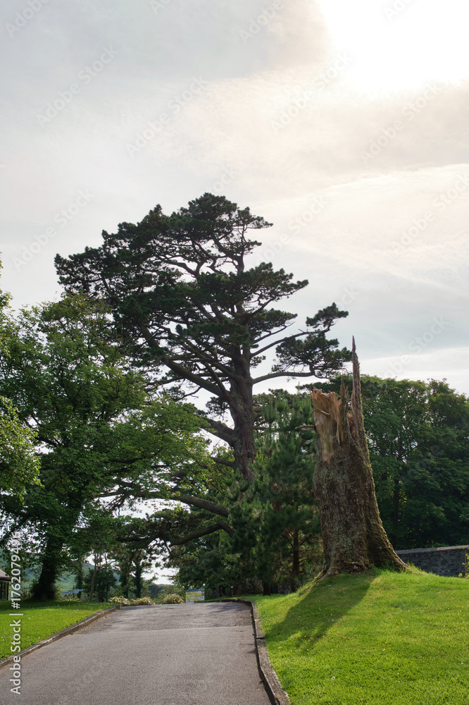 A scenic view of a road through lush green trees, with a large tree trunk in Ireland.