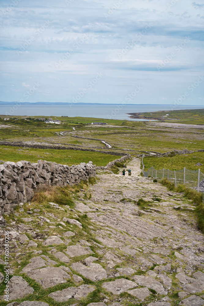 Scenic landscape of Ireland with a stone path leading through green fields towards the sea.