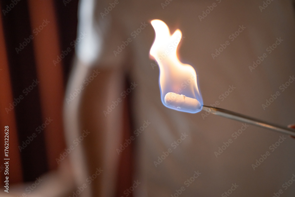 Close up of a burning cotton swab held with metal tongs during a demonstration or experiment. Concept of science, heat, fire safety, or sterilization process.