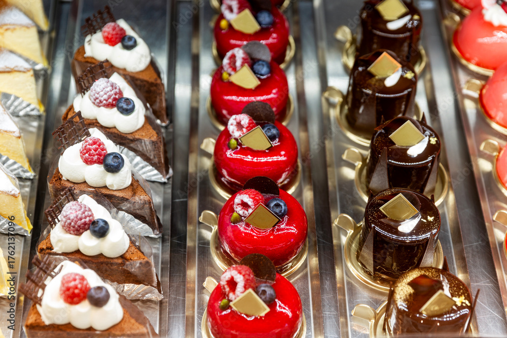 A beautiful, mouth-watering assortment of pastries in a store window. Holidays and celebrations. Close-up.