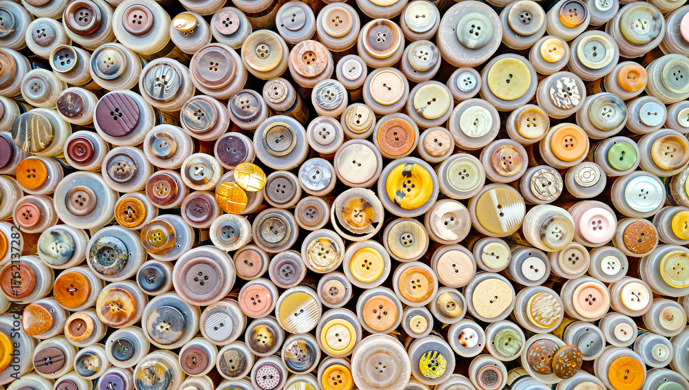 Assorted sewing buttons in various shapes and colors arranged closely as a decorative background