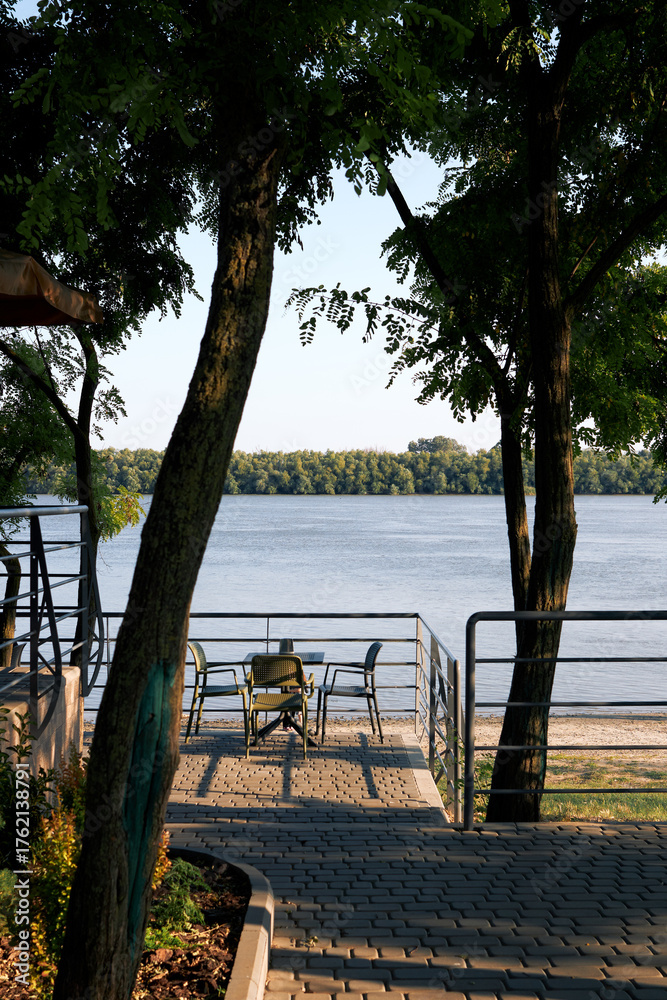 Peaceful riverside terrace with chairs under trees and view of calm water