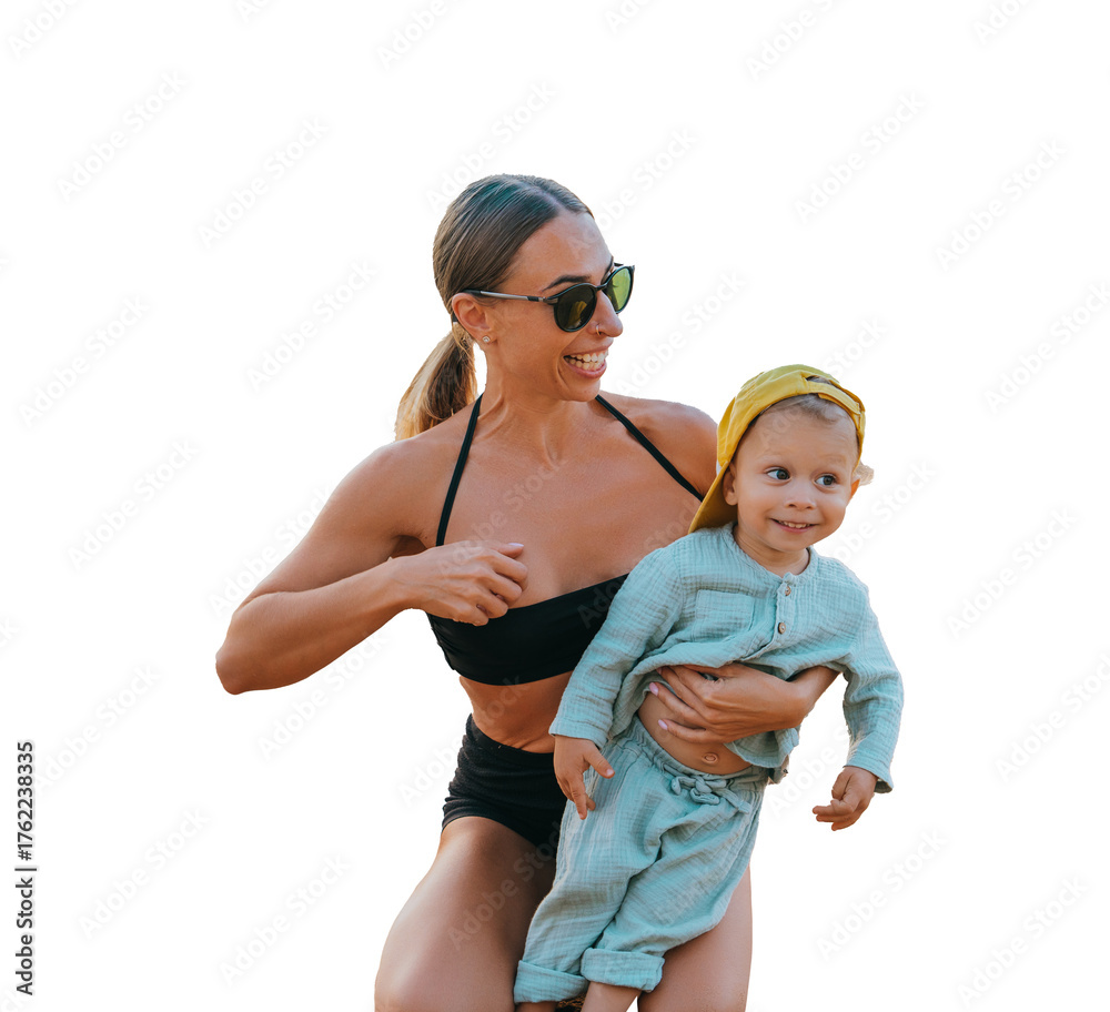 Blonde caucasian woman in swimsuit sitting on transparent background hugging son enjoying summer vacations. Little naughty American boy in casual playing with mom at seaside on weekend. Leisure.