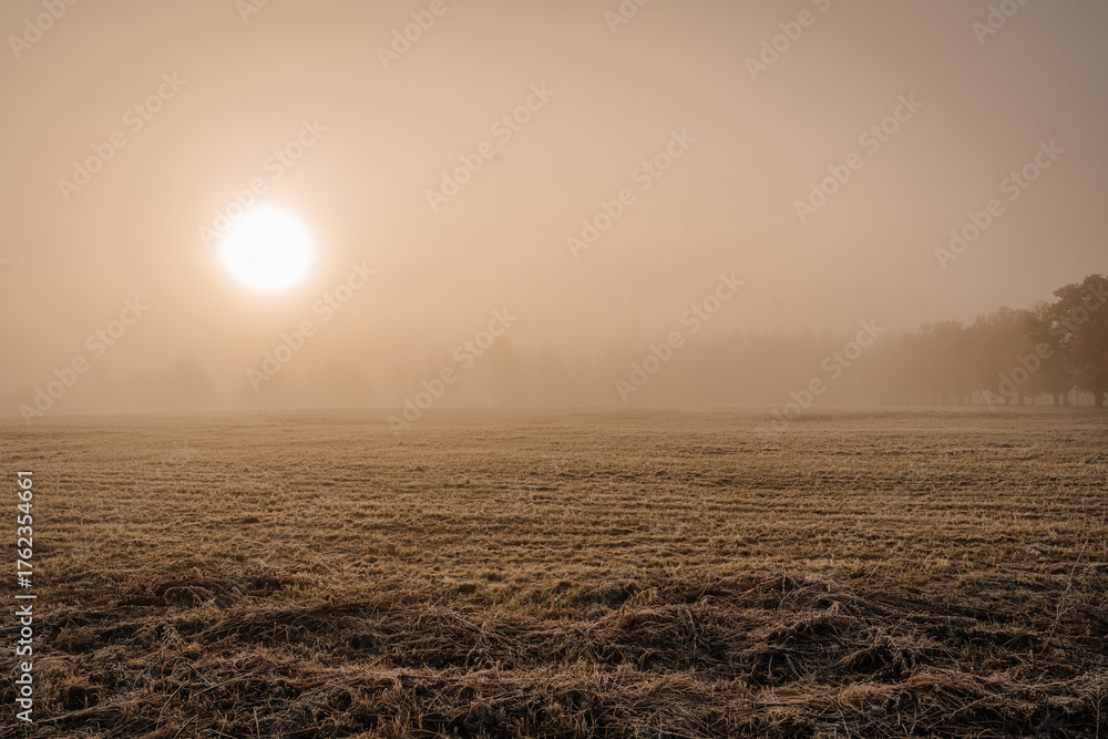 Foggy sunrise over a frosty field in rural Latvia. The sun glows through dense morning mist, creating a soft, golden-hued autumn landscape.