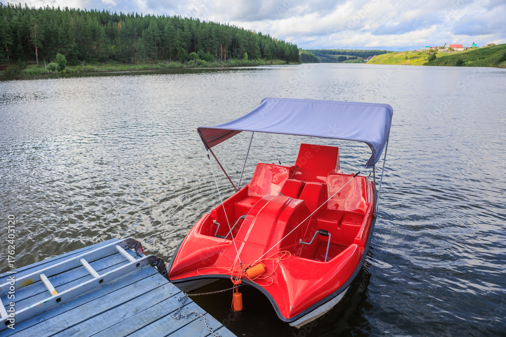 Red catamaran on the pier near the river bank