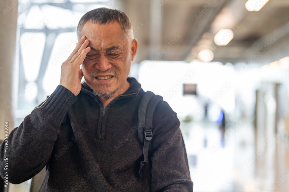 Sick unhappy senior man touching head serious depressed feeling headache thinking of problem, alzheimer, cancer, stroke and parkinson, disease and cerebral haemorrage