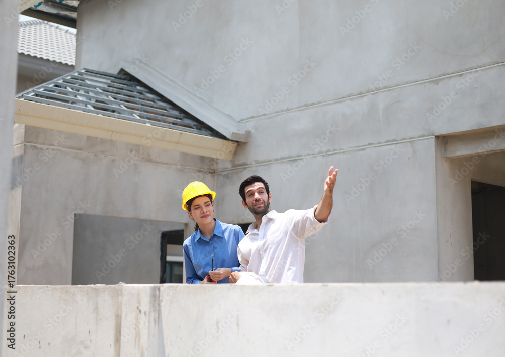 Female engineers and architects stand in front of a construction site, discussing their work, and discussing new technologies in housing construction.