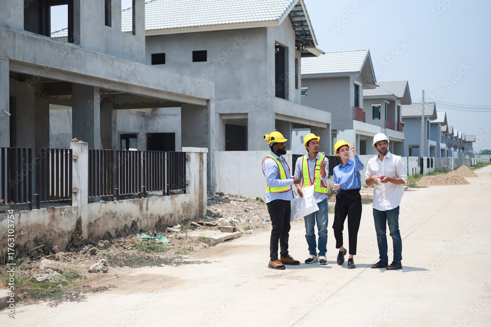 A group of civil engineers discussed and inspected the construction of houses according to standards to ensure they are strong and correct according to the design. Group meeting.
